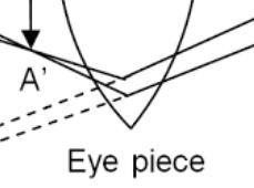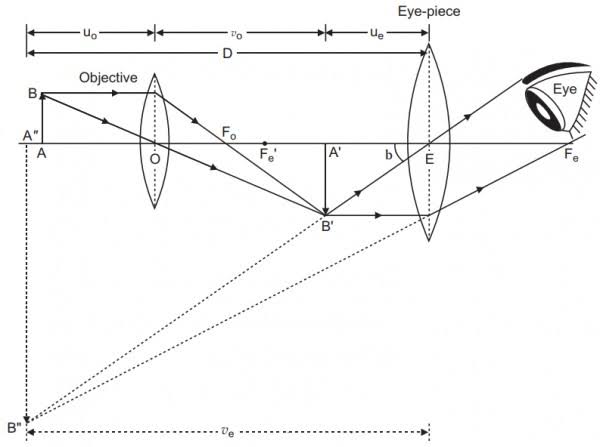 In the first image, the light rays form a real image A'B', which becomes the virtual object for the eyepiece. See, the original rays are carried forward to the eyepiece, which then form a virtual image, A"B".