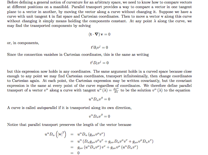 (all the other christoffel symbols are zero). Then let \vec{V} be defined by: \vec{V} = e_\theta, the basis vector in the \theta direction. Now, let's parallel-transport \vec{V} around the path \mathcal{P}(s) defined by letting (\mathcal{P}(s))^r=1, (\mathcal{P}(s))^\theta = s.