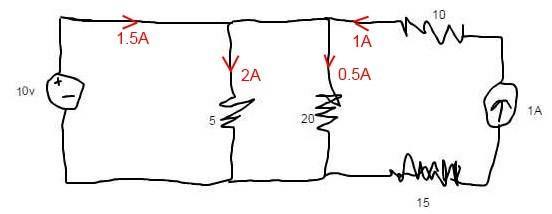 After aplying principle of super position and considering the voltage source in one scenario with current source open circuited and calculating current for each resistor and then short circuiting the voltage source and then again calculating each current. After that I added all currents for each individual resistor and caclulated the power output of each individual resistor by I^2R. The highest wattage I got was for the 5 ohm resistor (48.05W). So I concluded that the 5ohm resistor produces most heat. Is this correct? I have no solutions for this.