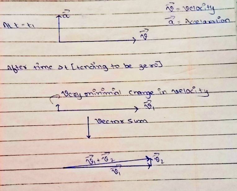 Sir can you please tell me from where can I get this proof.Ibix said:As @Bandersnatch notes, the problem is that you are allowing your velocity vector to change in your small time interval, but not the acceleration vector. If there's enough time for the velocity vector to change (possibly only infinitesimally) then there's enough time for the acceleration vector to change (possibly only infinitesimally). So the total acceleration in your ##\Delta t## won't be purely vertical, but will have a leftward component which will lead to it satisfying ##|\vec v_1+\vec v_2|=|\vec v_1|## (in the limit as ##\Delta t## goes to zero, anyway).