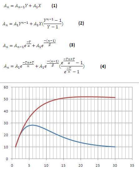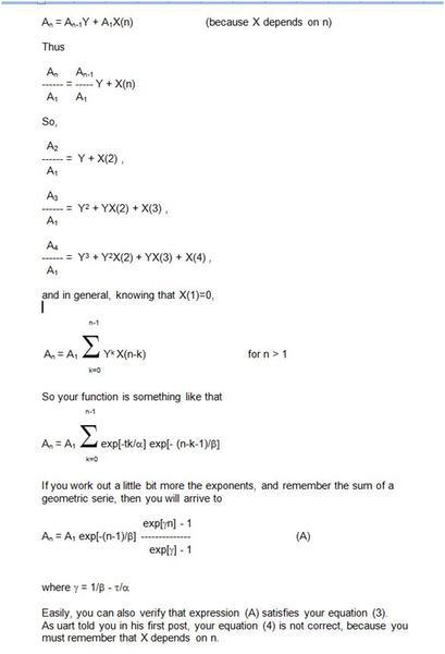 I got Equation 3. Thereafter, I tried to transform it in the same way, and then I got Equation 4. However, Equation 3 and 4 are not the same. For alpha=360, beta=5, A1=10 and T=1, these two equations give very different curves, as you can see at the bottom of the image (Equation 3 represented as the purple curve, and Equation 4 represented as the blue line). What am I doing wrong?
