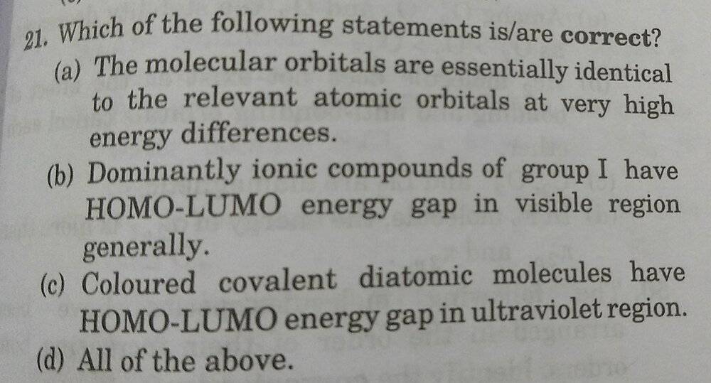 (c) Coloured covalent diatomic molecules have HOMO-LUMO energy gap in ultraviolet region.
