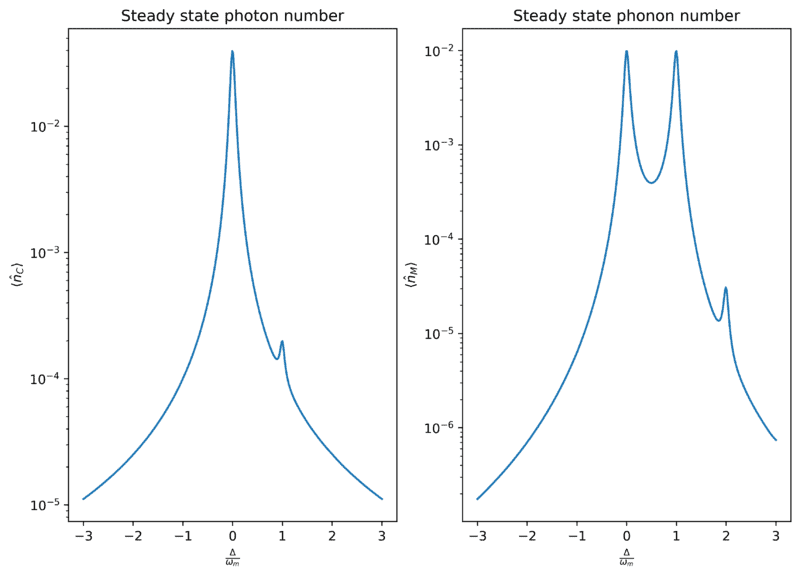 I have plotted the steady-state solution for the average photon number in the cavity, ##n_C##, and the average phonon number in the mirror, ##n_M## as a function of detuning. For this, I used QUTIP and obtained, with the y-axis on log scale (see attachment).This is the typical Lorentzian resonance curve. Now, we clearly see that there are peaks corresponding to ##\Delta = \omega_m$## and ##\Delta = 0##.