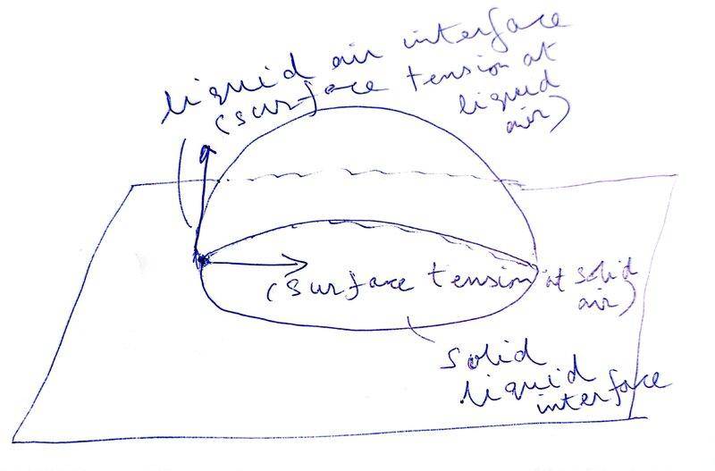 I think in the explanation below a very small element of the liquid at the line of contact between the horizontal solid surface, air outside the liquid and the liquid itself is being taken, and forces acting on such a small element are being shown. This very small element is to the left of shown diagram. The liquid is going to have a circular area of contact with the solid surface and we have taken a very small arc element on the periphery of the liquid that is touching all three i.e. solid, liquid and air. I guess this part of my understanding is correct?