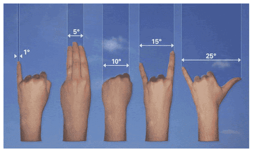 I am no astronomer and I cannot give a description of its position and the magnitude of its displacement in astronomical terms (declination and ascension). All I can tell is that this displacement seems to follow a circular path, with the radius contained within the span of only two, may be three hands throughout the seasons, in spite of the fact that in the meantime the Earth has moved hundreds of thousands, if not millions of miles along its orbit.