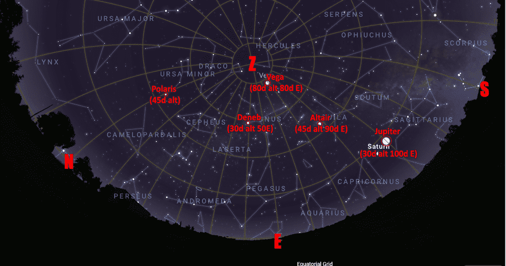 Since the North Star, from what I know, is not 90° vertical overhead, but probably less ( 70°, 80° ?), I reckon this body could be at 45°, 50° altitude East of the North Star.