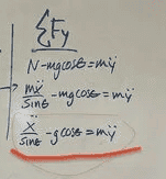 I then tried a different approach, as shown by the image with the whiteboard, and used the actual normal force and a component of the force of gravity. When I used this approach I got stuck and did not see anyway of attaining the correct answer.