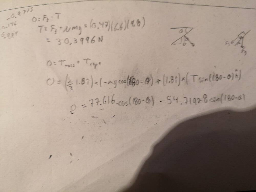 Participants express confusion regarding the role of friction and normal forces in the torque calculations, particularly when moments are taken around specific points. The discussion also touches on the complexities of using angles and unit vectors in torque calculations.