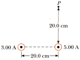 In the first picture, the magnetic field is on the 5A wire is apparently ...downwards? How? And the magnetic field on the 3A wire is downward? How is that work? First they don't tell you which way the current is going, up or down. Secondly, the answer is not 'into the page' or 'out of the 'page.' It is 'upwards' or 'downwards,' how come?