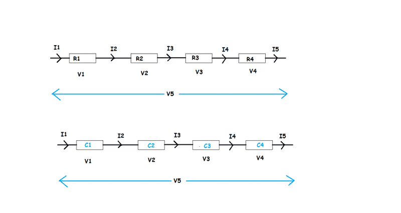 Then, what can you say about the current through series capacitors and what does that tell you about the charge flowing through each capacitor.: Reply [