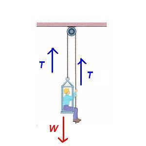 It seems to me that when he pulls down on the rope, the chair will move with a force upwards, but the other side will move with a force downwards and he will basically be in the same position unless he let's go of the rope with his hands.