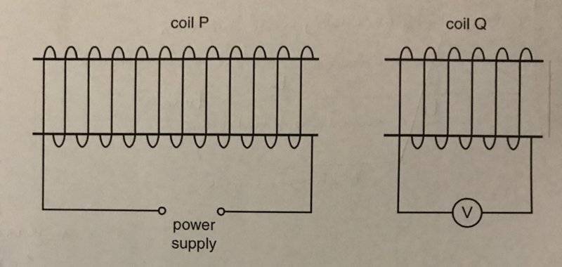 Two coils P and Q are placed close to one another. P is connected to a power supply whereas Q is only connected to a voltmeter and no supply (see attached diagram). The current in coil P is constant. An iron rod is inserted into coil P.