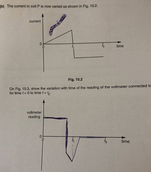 b) The current in coil P is now varied as shown in the figure ( see attached). Show the variation with time of the reading of the voltmeter connected to coil Q from time t=0 to time t=t2.