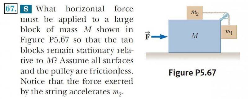 My answer: F = (m1g)(M+m1+m2)/(m2+m1)