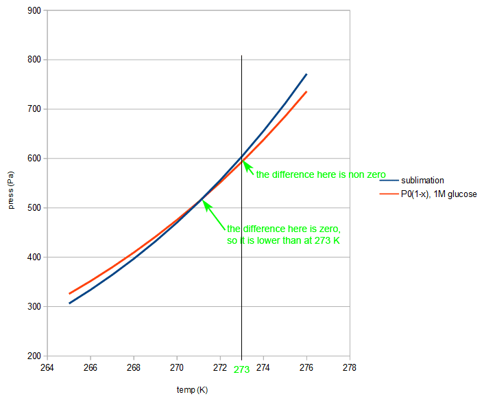 From this graph, I see that the curve for the ice is steeper than the curve for brine, that means before the melting point is reached, the decrease in vapor pressure is more for the brine than for the ice(so I was wrong), then how can the two vapour pressures even become equal? I can't make heads or tails of it. Hope you see my confusion.