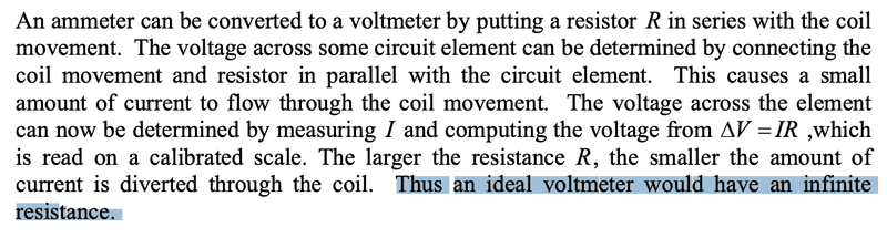 - Another participant notes that an analog voltmeter has components with finite resistance, which is accounted for in its calibration.