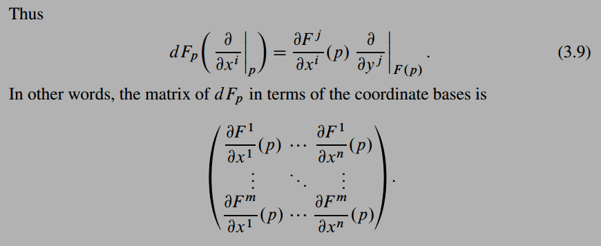 What (3.9) is saying is that \frac{\partial F^j}{\partial x^i}(p) is the jth component of the image of the ith basis vector. Thus if you have a tangent vector X^i \left.\frac{\partial}{\partial x^i}\right|_p, then dF_p will send it to Y^j \left.\frac{\partial}{\partial y^j}\right|_{F(p)} where <br /> Y^j = \frac{\partial F^j}{\partial x^i}(p) X^i. Note that the index i is being summed over, so must be the second index (labelling columns) and j is the first index (labelling rows). This is of course the opposite of the standard convention, but consistent with the matrix following (3.9).