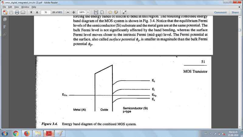 - A reference to work function differences is made, explaining that these differences lead to band bending in equilibrium conditions and the significance of flat band voltage (Vfb) in determining further gate voltage effects.