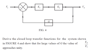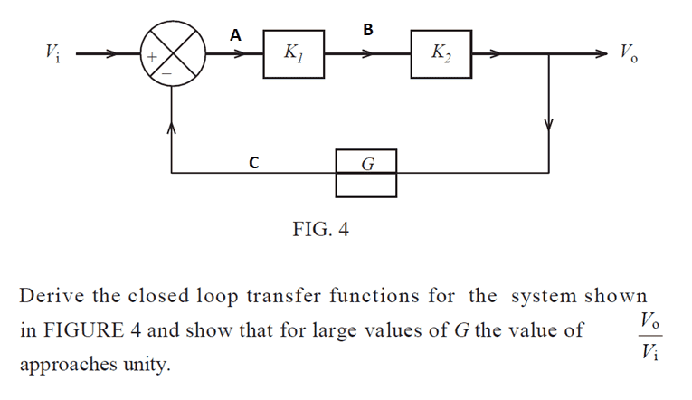 - Derive the closed loop transfer function for the system shown in FIGURE 4 and show that for large values of G the value of Vo/Vi approaches unity.