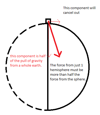 I am having a problem with visualizing why Newton's Law of Universal Gravitation (NUGR) holds true when objects get close together. F=Gmm/r^2 makes sense for planets that are far away because each object can be treated as a point with gravity acting at the center of each object. For a person standing on the surface however, there is a significant portion of the mass of the Earth that is not directly below the person. Of course the mass is evenly distributed on each side, so the direction of the force is straight down, but only the vertical components of each part of the mass of the sphere is acting downwards, the horizontal components will all cancel out. If NUGR holds true for each portion of the planetary mass then the resultant force vector will calculate to a lower magnitude than the whole Earth because of the horizontal forces cancelling out. I know that I must be visualizing something wrong, but I don't see it. Before I started thinking about this, I just accepted that gravity acts from the center of the planet because the sum of the gravitational force from every point within the sphere adds up to the force we feel as if it is actually coming from the center. If that is the case then shouldn't NUGR take into account how much of the mass is not directly below?