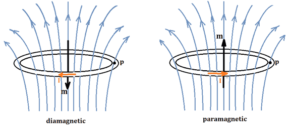 View attachment 209380The B field is stronger below each loop. If you pick a point of the current loop, such as P in the diagram, you can see that B is not vertical. B has a horizontal component. If you use the right hand rule to determine the direction of the magnetic force on the current due to the horizontal component of B, then you find that the diamagnetic loop is pushed upward away from the strong field region. The paramagnetic loop is pulled downward toward the stronger field.