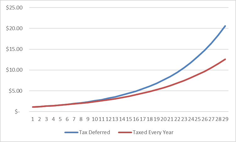 The y/y change on the 'Taxed every year' is simply (1+R(1-T)), however the 'Taxed Deferred' y/y change begins at (1+R(1-T)) but converges over time to (1+R) (at about 50 years in this example), - would like to understand this - taking derivatives with respect to n does not help much as you just get a log(1+r)(1+r)^n terms for both functions.