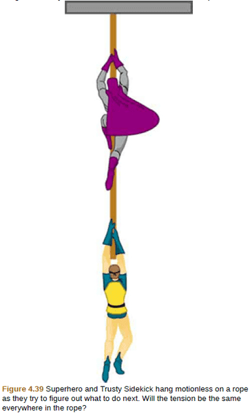 The total tension on the rope, since the mass of the rope itself is negligible = 882 + 539 = 1421 N. Because a rope pulls with equal tension on each object, the tension in the rope above Superhero is just 1421 N - the total weight it's being pulled down by.
