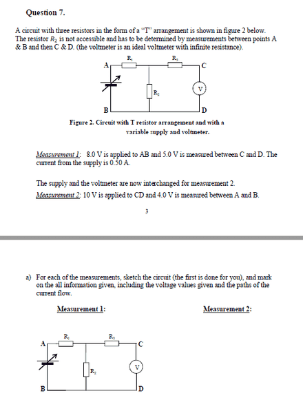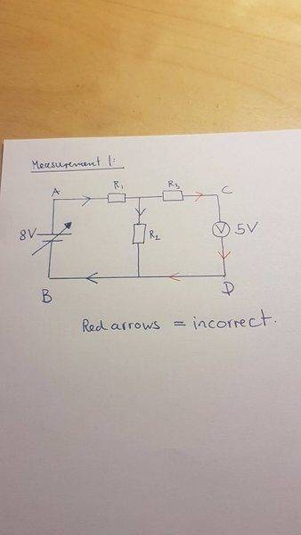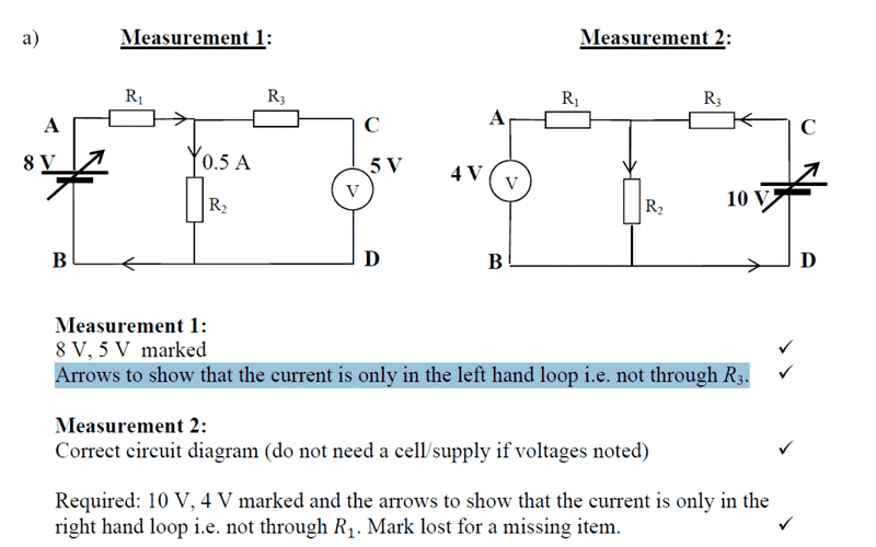 I got both voltage values correct. However the paths of the current flow was incorrect for both measurements. (See the attached file for solution) It specifically states that "Arrows to show that the current is only in the left hand loop i.e. not through R3." are needed, but I also included arrows for the RH loop.
