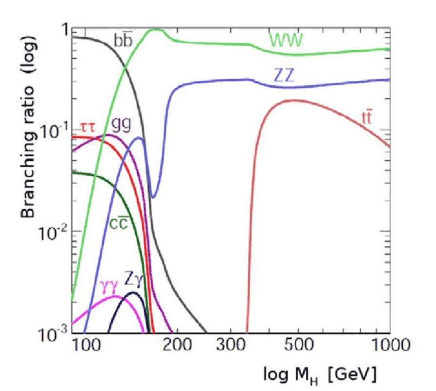 Hello! In the (famous) plot I attached we have the branches ratios for the Higgs decay for different Higgs masses. I am sure that sitting down and doing the Feynman diagram calculation (to 1 or 2 next to leading order?) I will get these curves. But I am a bit confused about the physics intuition behind the decay to W and Z. The coupling between Z and Higgs is bigger than the coupling between W and Higgs (by a factor of ##\frac{1}{(cos{\theta_w})^2}##). Yet the branching ratio for Higgs to WW is almost double that Higgs to ZZ for a wide range of energies. Of course the mass of the Z is higher so the phase space is smaller in this case, compared to W, but I wouldn't expect that a 10GeV difference to create such a big effect on the branching ratio, especially at big Higgs masses where a 10GeV difference should be almost insignificant. Is there a physical intuition as to why is this happening or it's just math and renormalization group stuff, without an actual deep physical meaning? What I mean by this is: could someone, knowing all the parameters involved, but without actually calculating the Feynman diagrams, predict that the branching ratio to W will be bigger than to Z? Thank you!