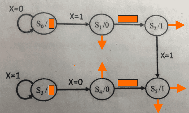 Figure 3-5 shows the state transition diagram of Moore type sequential circuit M that observes the time series of input X and outputs 1 when time series 010 or 101 appears, and 0 otherwise (Incomplete). Let S0 be the initial state (assume that 0 is input consecutively twice or more consecutively) and complete this state transition diagram according to the notation without increasing the number of states. Note that the time series will continue indefinitely.