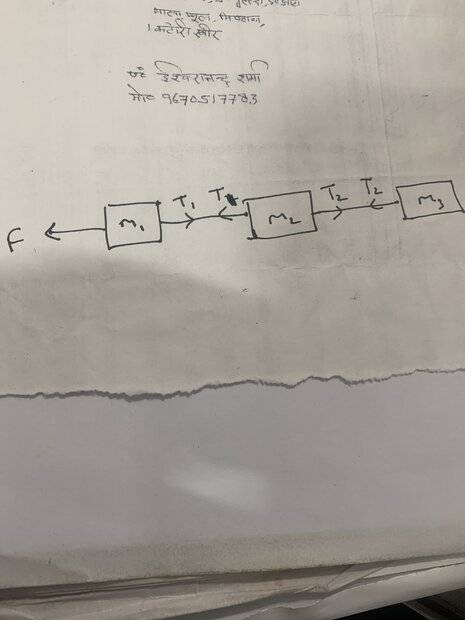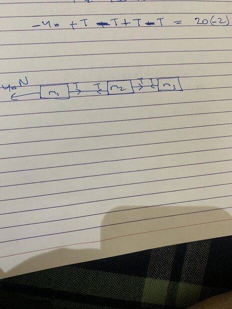 - Three blocks of mass 10, 6,4 kgs are placed on friction less surface. Force of 40N pulls the system. Calculate T.