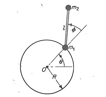 the question is : particles m1 and m2 each of mass m are connected by a massless rod with length l , these particles move on a frictionless horizontal plane as shown in the screen shot , the movement of m1 is fixed on a frictionless circular track of radius R , find the E.O.M !