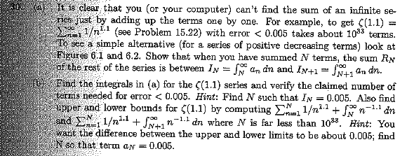 I managed to do the computations but unfortunately I don't understand why the trick works in part b). It is said that N has to be very very big to find the answer within 0.005, yet in part b I find N ≈ 130 (which I know is right). That means the solution can now be found with error < 0.005 with only 130 terms. Is that right? Could someone explain to me what's going on brievely? This is a scan from Mary L Boas mathematical methods book which I'm self-learning from, and unfortunately this is the only information found on this trick to evaluate the error.