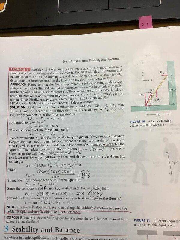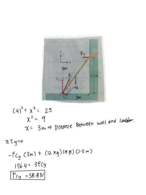 1. The following is my attempt to solve Fcy using the fact that the addition of torque = 0. I considered force mg and Fcy and their lever arms to set up the equilibrium. But this method seems not to work? Why?