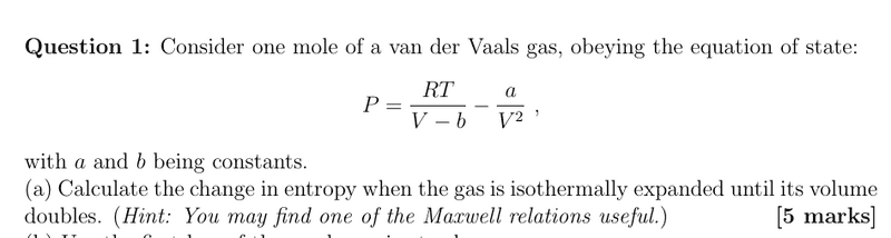 $$\Delta S = \int_i^f\frac{P}{T}dV$$ as isothermal implies that ##dQ=PdV##. Next, substituting in ##P## gives $$\int_i^f\left({\frac{R}{V-b}-\frac{a}{TV^2}}\right)dV$$