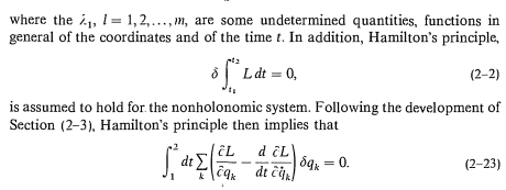 I don't understand why it is assumed that the principle of least action is valid for a non holonomic system. On chapter 1, section 1.4, Lagrange Equations are derived from D'Alembert's Principle assuming holonomic constraints and on chapter 2, section 2.3, it is shown that, for a holonomic system, defining the action S as a time integral of the Lagrangian and making it stationary leads us to the same Lagrange Equation, which leads us to state Hamilton's Principle. To arrive at these results, it was needed to assume holonomic systems. However, on section 2.4, the book states that: It is possible to deduce the equations of motion from Hamilton’s principle in the special case in which the non-holonomic constraints are differential equations of the form: