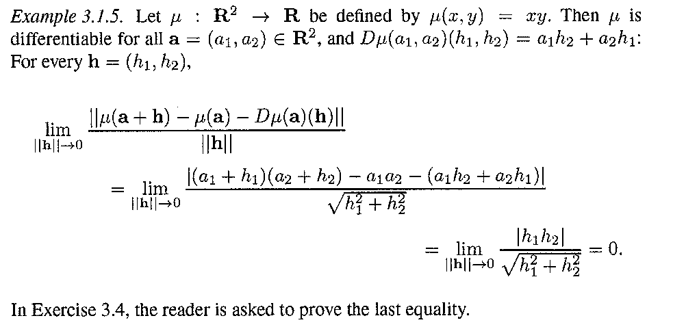 "... ... ##\displaystyle \lim_{ \mid \mid h \mid \mid \to 0} \frac{ \mid h_1 h_2 \mid }{ \sqrt{ h_1^2 + h_2^2 } } = 0 ##... ...Can someone please show and explain exactly how/why it is that ##\displaystyle \lim_{ \mid \mid h \mid \mid \to 0} \frac{ \mid h_1 h_2 \mid }{ \sqrt{ h_1^2 + h_2^2 } } = 0## ... ...