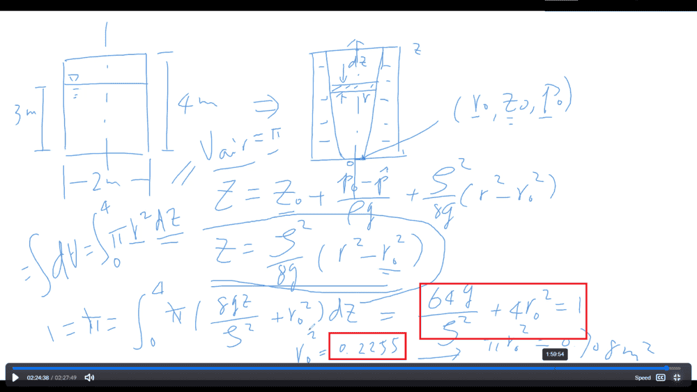 The discussion revolves around a fluid dynamics problem involving a closed cylindrical tank containing water and its behavior when rotated at a constant angular velocity. The specific focus is on understanding the value of ro = 0.2255 as referenced in a professor's handwritten notes and its relation to the calculations performed by the original poster.