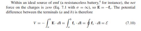 2) The terminal voltage goes down as the battery is used and charge is transferred from positive to negative terminal. Assuming that 1) is true then at this point it is no longer true that ##\vec{E}=-\vec{f}_s##. For this to be true we would need to let the battery charge up so that ##\vec{E}## would increase in magnitude to the value of the magnitude of ##\vec{f}_s##.