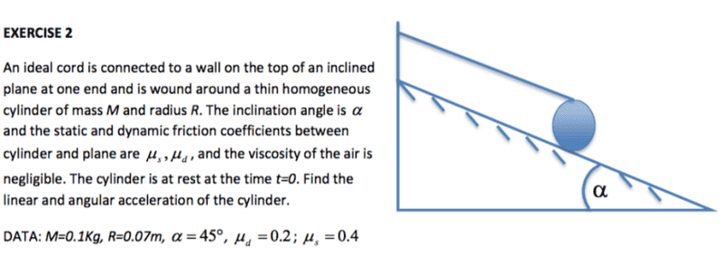 Edit: ##\vec{r}_1## points from the cylinder's radial center to the point at which the cord is no longer in contact with the cylinder. ##\vec{r}_2## points from the radial center of the cylinder to the line along which the cylinder is in contact with the inclined plane.