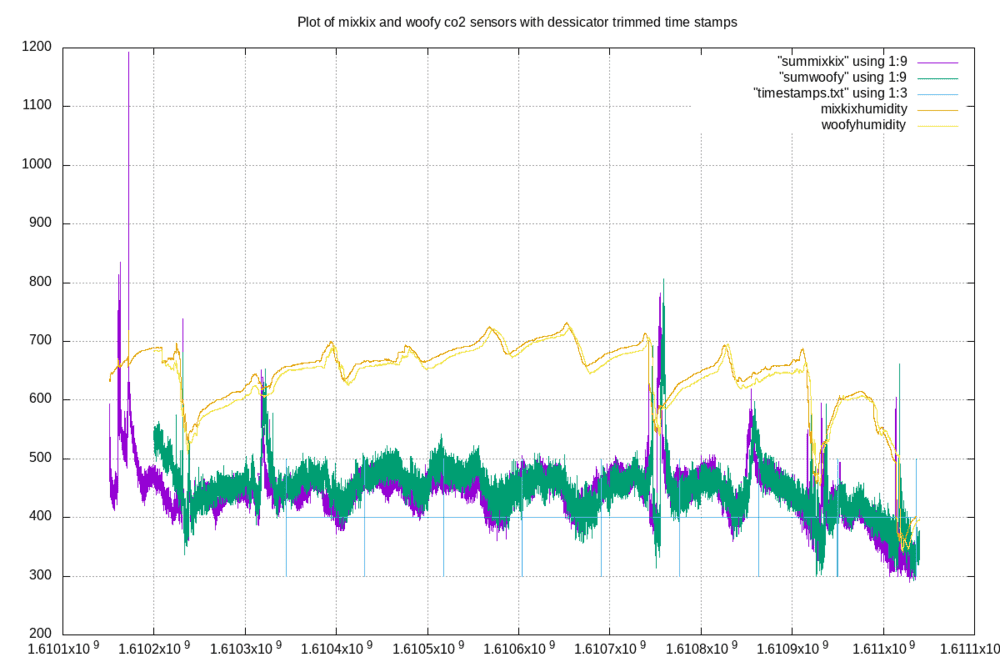 An example of the output from the analyzer for one day is shown in Figure 1 [below]. Two separate intake lines are used for sampling ambient air. The intake lines are from the top of a 38 m tall tower next to the observatory, to avoid any influence on the measurements by human activities at the observatory. Each intake line is measured for five minutes, alternating between line 1 and line 2. Once an hour, the reference gas R0 is measured for five minutes. Once per day, two target tanks are measured for fifteen measurements each (seen in hour 6 and hour 17 in Figure 1). The first few minutes after each gas change are not used to allow time for the previous gas to be completely flushed from the analysis system. The difference of the ambient air measurements from the reference R0 are calculated, and these differences are put into equation 1 to calculate the true ambient mole fraction CO2. By making the measurements relative to the difference from R0, any short term drifts in the analyzer are accounted for.