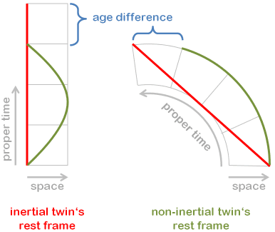 In this case, the green guy looks like he's staying put while the red guy moves first in the negative direction and then back. It seems like we should be able to go through all the same steps that were explained in the FAQ and discover that this time the green guy's proper time is the greater one whether we use perpendicular or oblique axes. Something tells me I can't be the only one who is thinking along these lines so if anyone can explain where the error in my reasoning is, you'd not only be helping me out but maybe others as well. Perhaps an explanation could be added to the FAQ.