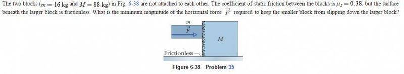 The two blocks (m=16kg and M=88kg) are not attached to each other. The coefficient of static friction between the blocks is us=0.38, but the surface beneath the larger block is frictionless. What is the minimum magnitude of the horizontal force F required to keep the smaller block from slipping down the larger block?