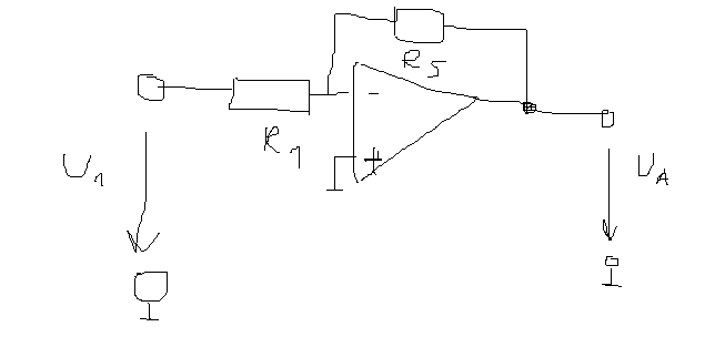 By no means a pretty picture but I think it will suffice. So I get that Ua is simply ## U_{A} = -\frac{R5}{R1}U_1## And according to the solutions this is correct. Now I did the same thing for U2 and I get the same circuit (simplified) but the first resistor is R2 and not R2 so the voltage is ##U_{A} = -\frac{R5}{R2}U_2 ## But according to the solutions it shouldnt be the resistor R2 but rather the resistor R1