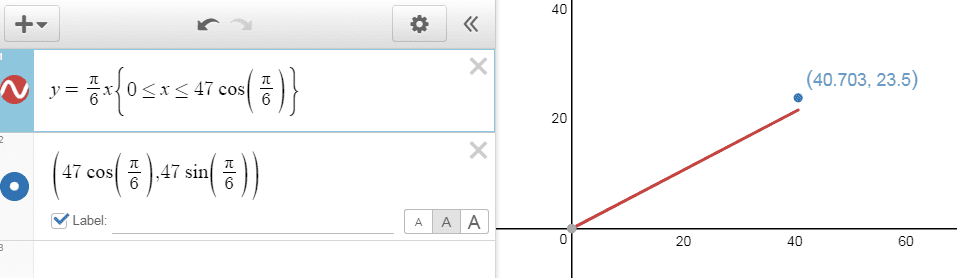 The discussion centers on the behavior of points on a graph in Desmos, specifically addressing why a point does not appear on the endpoint of a line. The mathematical expression $\frac{\pi}{6} \cdot 47 \cos(\frac{\pi}{6}) < 47 \sin(\frac{\pi}{6})$ is analyzed, leading to the conclusion that the slope, represented as $m = \frac{1}{\sqrt{3}}$, is not equal to $\frac{\pi}{6}$. This indicates a misunderstanding of the relationship between angles and slopes in the context of graphing.