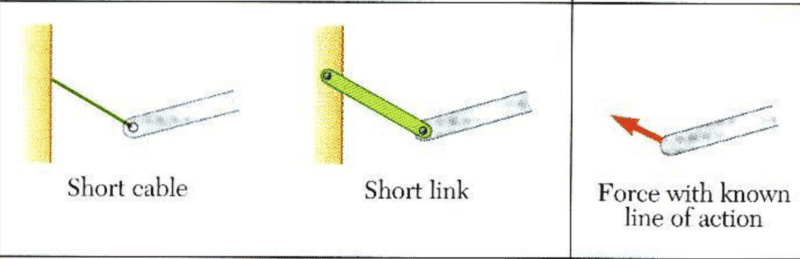 - It is noted that while a rope can only exert force in its direction, the short link's behavior is influenced by the pins at both ends, which restrict the force transmission direction.