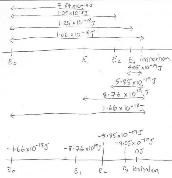 An element has an ionization energy of 1.66 × 10-18 J. The three longest wavelengths in its absorption spectrum are 253.7 nm, 185.0 nm and 158.5 nm. Construct an energy-level diagram for this element.