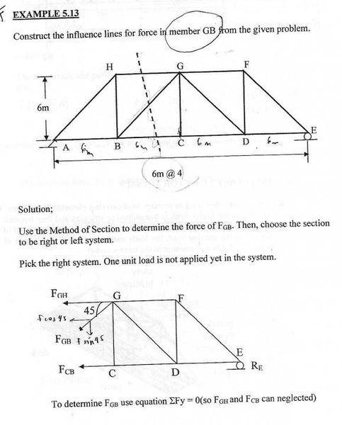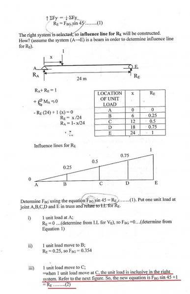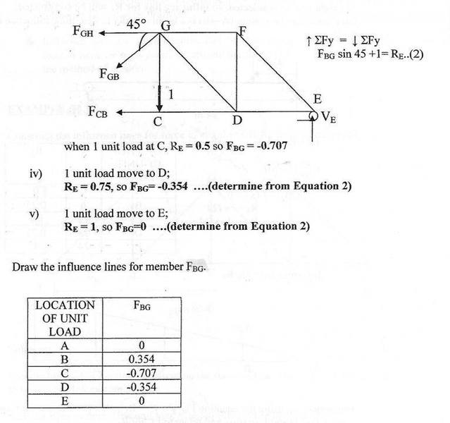 The discussion focuses on the treatment of unit loads in truss analysis, specifically when a unit load is moved to point B. Participants clarify that the unit load at point C is included in the system's equilibrium equations, while its effect at point B is not directly considered in the same manner. The confusion arises from the interpretation of vertical force equations, where the author simplifies the equation to 0.25 - FBG sin45 = 0, effectively ignoring the unit load and horizontal forces. This simplification is a common practice in structural analysis to maintain equilibrium without explicitly including every load in the calculations.