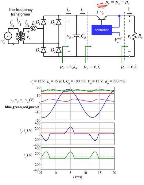I am doing a homework problem for my Power Electronics class. I have attached the relevant image. My question is, (referring to the TOP plot) why is the voltage regulator waveform (purple curve) identical to the voltage waveform coming from the diode bridge (green curve)? Shouldn't it be the inverse? My understanding was that when you add the voltage regulator waveform and the waveform that isn't constant (which would be the green curve in this case) you will get a constant voltage (red curve). However, the way it is shown, it would seem like you have to subtract them. Why is this??