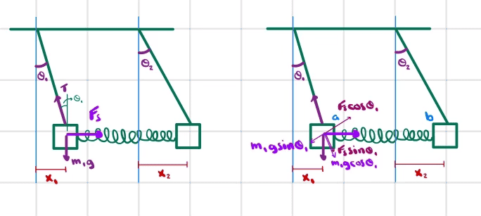 The discussion revolves around the relationship between vertical and horizontal displacements in a coupled oscillator system, specifically examining why vertical displacement is considered second order in horizontal displacement. The context involves pendulum mechanics and small angle approximations.